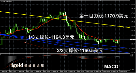 黄金阴阳烛录得后期阴回落,后期柱体色日均线中位,短线MACD示呈中性,黄金价格短线或偏于向1170美元附近攀升,低位支撑可分段参考1165和1163美元附近支撑。