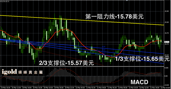 白银阴阳烛录得阴阳烛间隔出现,整体处于红色日均线中位,横盘运行趋势非常明显,短线MACD显示弱势多头主导,白银价格晚上或首先在15.7美元附近徘徊,随后跟随美指逆向运行,低位支撑可首先参考15.65美元附近。