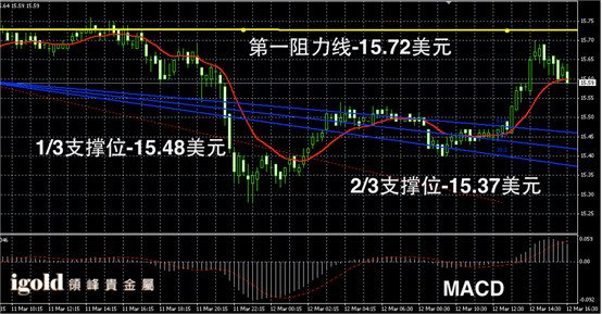 白银阴阳烛录得末端阴烛回落,柱体处于红色日均线中位,短线MACD显示弱势多头主导,白银价格或在15.6美元附近徘徊,美盘时段后,美指若回升白银价格或承压,美指若跌破99,白银价格或仍有部分反弹空间。低位支撑可首先参考15.5美元附近。