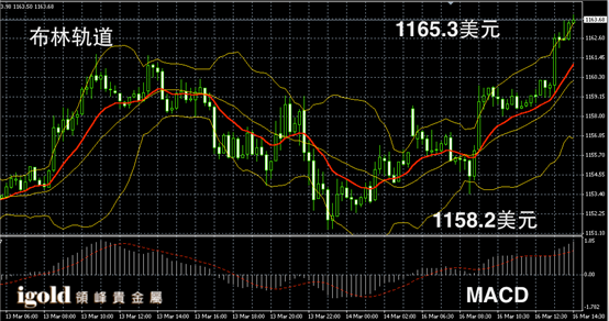黄金短线录得阳烛大幅增多,且高于红色日均线,布林轨道区间上探,短线MACD显示多头主导,午后黄金价格或首先回落至1162美元附近持稳,高位若突破1166美元,多头或继续扩大,否则偏于区间横盘运行。