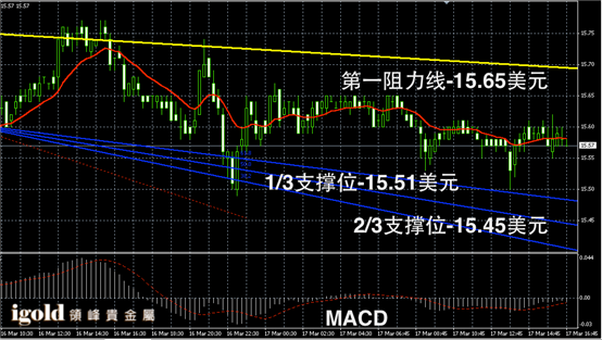 白银阴阳烛录得柱体处于红色日均线中位,柱体聚焦明显,短线MACD显示呈中性,白银价格晚上或继续区间震荡,低位若跌破15.5美元附近空头或增加,高位信号可参考15.65和15.7美元。