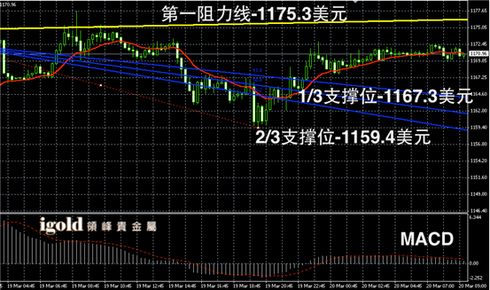 黄金阴阳烛录得聚焦明,整体处于红色日均线中位,短线MACD显示呈中性,黄金价格上午或继续在1171美元附近徘徊,低位若跌破1168美元,或小幅下行,目前多头反弹动能较低。