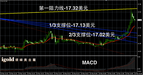 阴阳烛录得柱体高于色日均线,末端阴小幅回落,短线MACD示多,短线价格或在8点前小幅回落,随后再跟随美指行逆向波,多信号可参考17.35美元,低位空信号可参考17.15美元附近。
