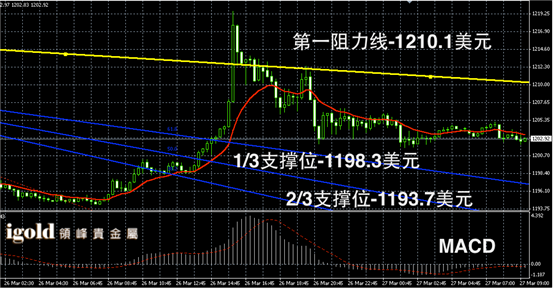 黄金阴阳烛录得后期回落趋势,柱体收短,短线MACD示呈中性,黄金价格或在1201美元附近横运行,午后2点左右,振幅或有所增加。