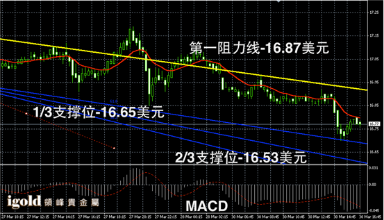 白银阴阳烛录得下行后,末端出现了小幅的回升,短线MACD显示空头主导,白银价格晚上或首先在16.8美元附近横盘运行,晚上8点至10点前后,或有新的走势,高低多空信号可分别参考16.67和16.9美元附近。