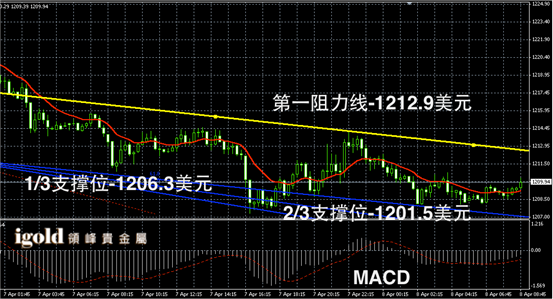 黄金阴阳烛录得后期柱体收短,整体处于红色日均线中位,短线MACD显示弱势空头主导,黄金价格上午或向1211美元附近小幅靠拢,低位支撑若跌破1207美元,可作为空头信号,多头突破1213美元前不建议大幅做多。