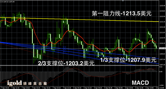 黄金阴阳烛录得短线分布在红色日均线中位,MACD显示弱势多头主导,金价晚上8点前或继续围绕1210美元附近运行,随后或随美指进行逆向运行,高低若有突破1207-1212美元区间,可顺势看涨看跌。