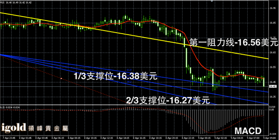 白银阴阳烛录得回落趋势明显,末端阴烛下行,短线MACD显示空头主导,白银价格上午或仍会回调,低位建议密切留意16.35美元附近支撑,若跌破空头或大幅增加。高位突破16.5美元前不建议大幅做多。