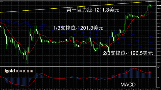 黄金阴阳烛末端录得阳烛大幅增多,且远高于红色日均线,短线MACD显示多头主导,黄金价格上午或开始小幅回落,短线偏于回落至1203美元附近,高位多头信号可参考1208美元附近。