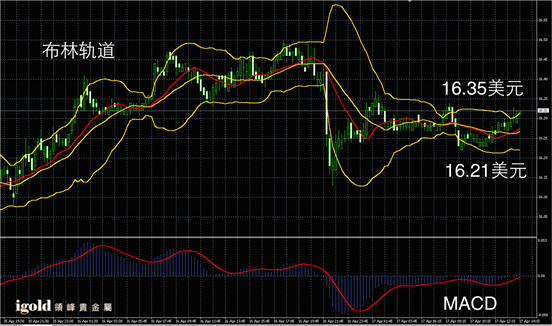 白银阴阳烛录得阴阳烛高低交叉于红色日均线中位,短线MACD显示呈中性,布林轨道区间收平,白银价格午后或小幅上探16.35美元附近,低位空头信号可参考16.23美元附近。
