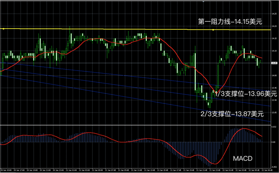 白银阴阳烛录得回落后小幅持稳,后期处于红色日均线中位,短线MACD显示呈中性,白银价格上午或在14.05美元附近徘徊,高低多空信号可分别参考14.15和13.95美元附近。