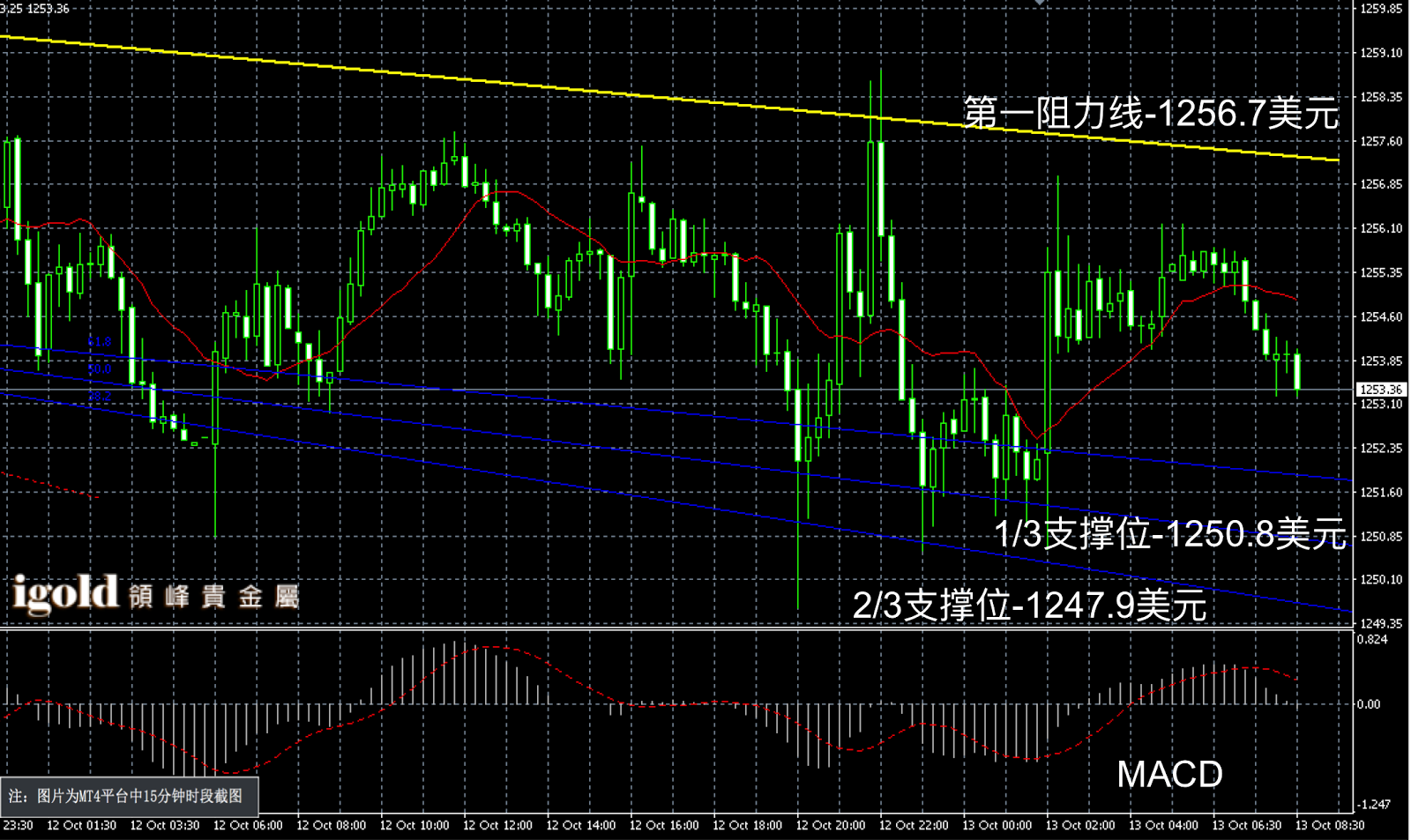 黄金阴阳烛后期小幅回落,末端低于红色日均线,短线MACD显示呈中性,黄金价格上午或小幅回升至1254美元附近,高低多空扩大信号可分别参考1256.1和1252美元附近。